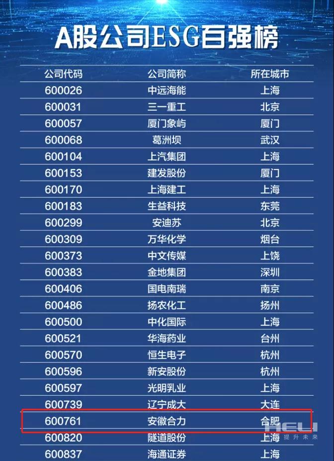 近日,由證券時報編制的《A股公司ESG百強榜》在“中國企業(yè)ESG發(fā)展研討會暨2021中國證券公司年會”上發(fā)布,安徽合力股份有限公司(以下簡稱“安徽合力”)憑借出色表現(xiàn),成功入選“A股公司ESG百強榜”。